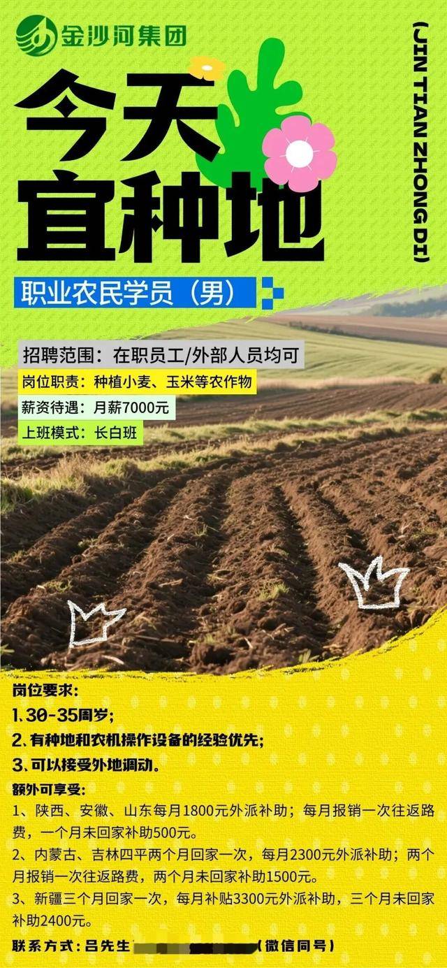 记者注意到,有种地和农机操作设备的经验优先,可以接受外地调动。此外,公告还补充道:陕西、安徽、山东每月1800元外派补助;每月报销一次往返路费,一个月未回家补助500元;内蒙古、吉林四平两个月回家一次,每月2300元外派补助,两个月报销一次往返路费,两个月未回家补助1500元;新疆三个月回家一次,每月补贴3300元外派补助,三个月未回家补助2400元。